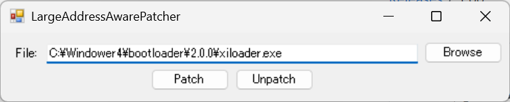 LargeAddressAwarePatcher.exeを実行し、Browseからxiloader.exeを選択し、Patchボタンを押すことでxiloader.exeが書き換わりLAAが有効になります。